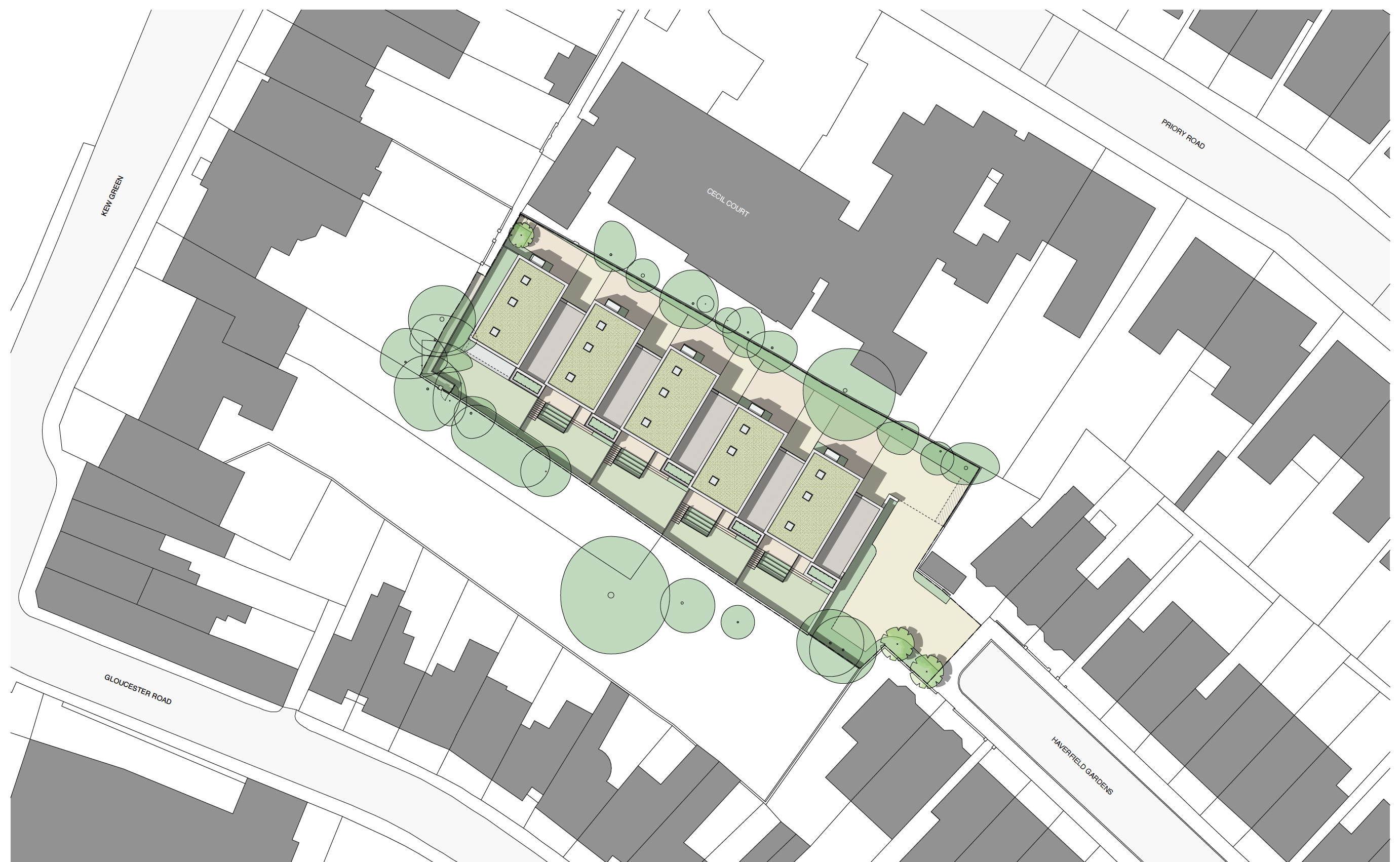 The scheme on Haverfield Gardens, is a sensitive infill project carefully integrated and positioned on the site to avoid over-looking and any loss of privacy to the many adjacent properties. The mews style properties are compliant with the London Design Code and have been designed in accordance with all relevant Local Authority Policy requirements. The scheme brings new life to an otherwise low grade, underused site. A design cue has been taken from the scale of the adjacent terraced housing and studies have been carried out on the proportion of solid to void of the adjacent elevations